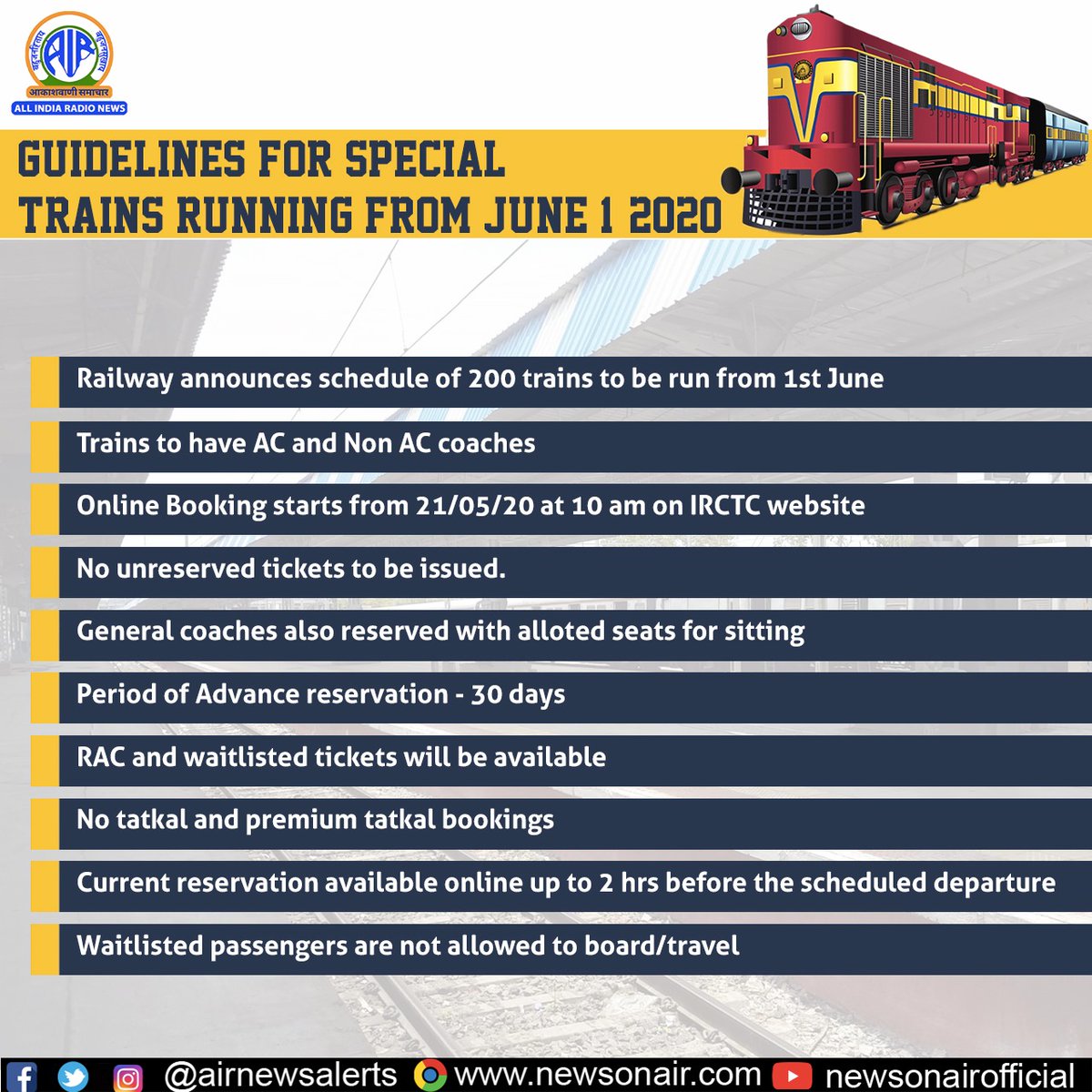 All India Radio News On Twitter Indian Railways Announces The Operation Of 200 Trains From 1st June Online Booking Starts Today Indianrailways Indiafightscorona Read The Guidelines Https T Co Ipfb2iosf7 - Indian railway is launching new and new initiatives to increase passenger amenities.