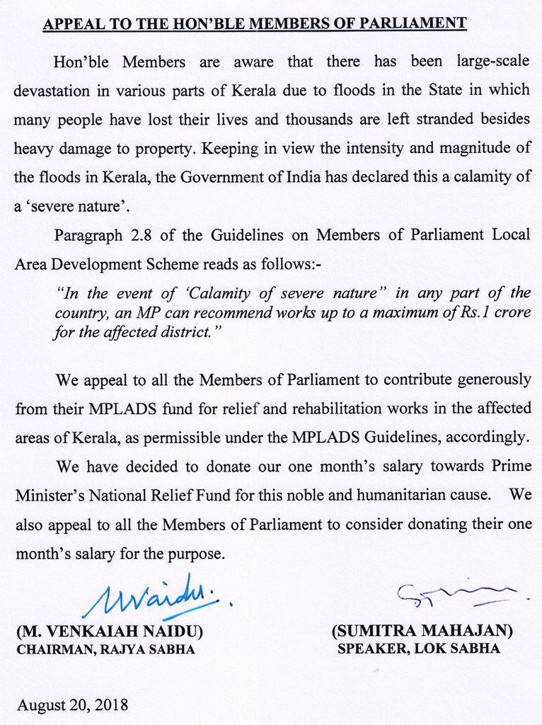 Vice President Of India A Twitter We Took The Lead By Announcing Our Decision To Donate Our One Month Salary For Relief Works In Kerala Also Appeal Mps To Consider Donating - Lok sabha is not a permanent body, and its tenure is for five years.